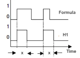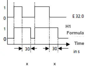 The time starts when the edge of the result of the formula is rising. A result of the formula = “0” does not affect the time. Queries return “1” as long as the time has not yet run out.