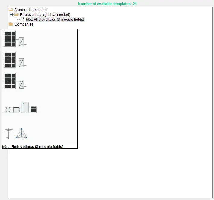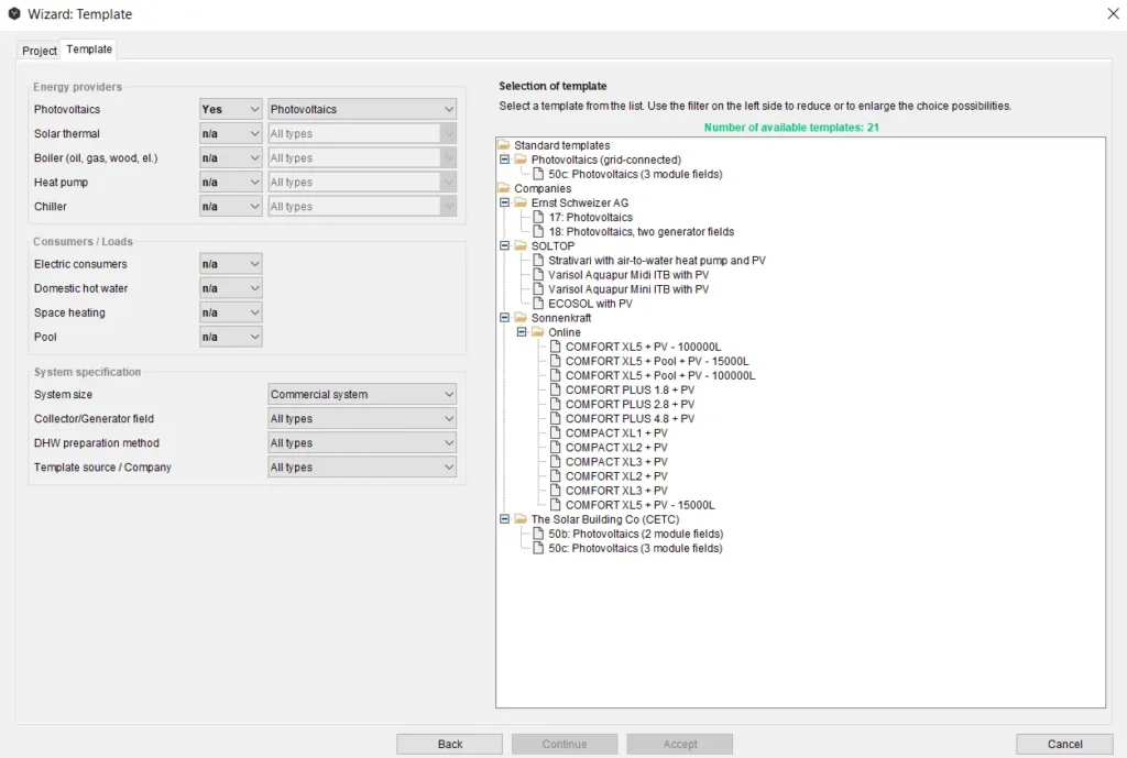 In the Wizard first the location has to be defined either from the map or from the database. After the location has been defined, in the next step you can choose the criteria for the PV grid-connected system and the corresponding system template.