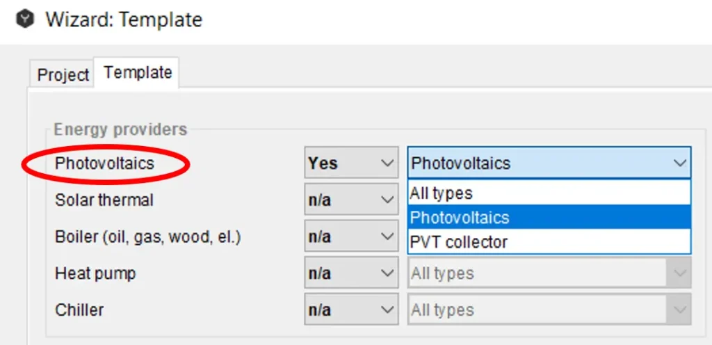 In the drop-down menus, you can first choose in the upper left side of the dialog window what kind of energy providers you would like to have in your project. Here you can choose one or more types of providers.