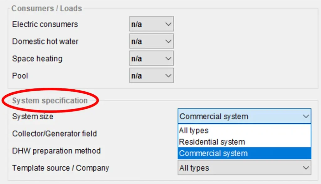 ‘N/a’ (not applicable) means that this type of energy provider is not a criterion for the selection of the system (the list will show systems with and without this component).