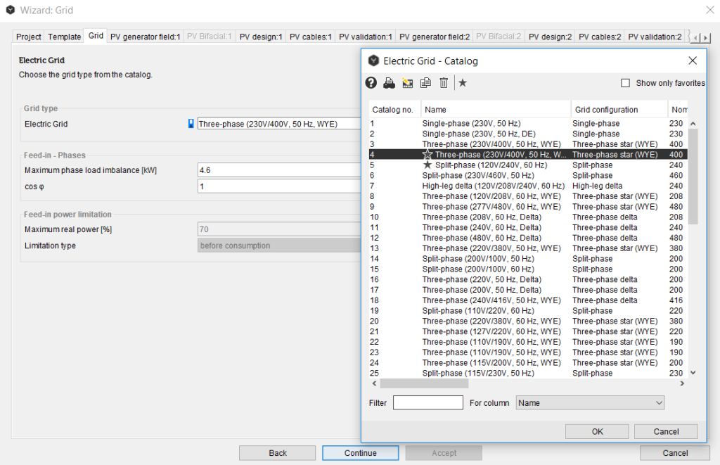 When the template is chosen, in the next step the appropriate grid configuration, nominal voltage and nominal frequency can be defined from the catalog.