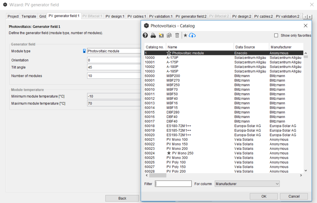 In the next step of the Wizard the PV Generator can be specified. You can find more detailed information about photovoltaic modules and their parameters in the section PV Modules and Parameters PV Modules of this User Guide.