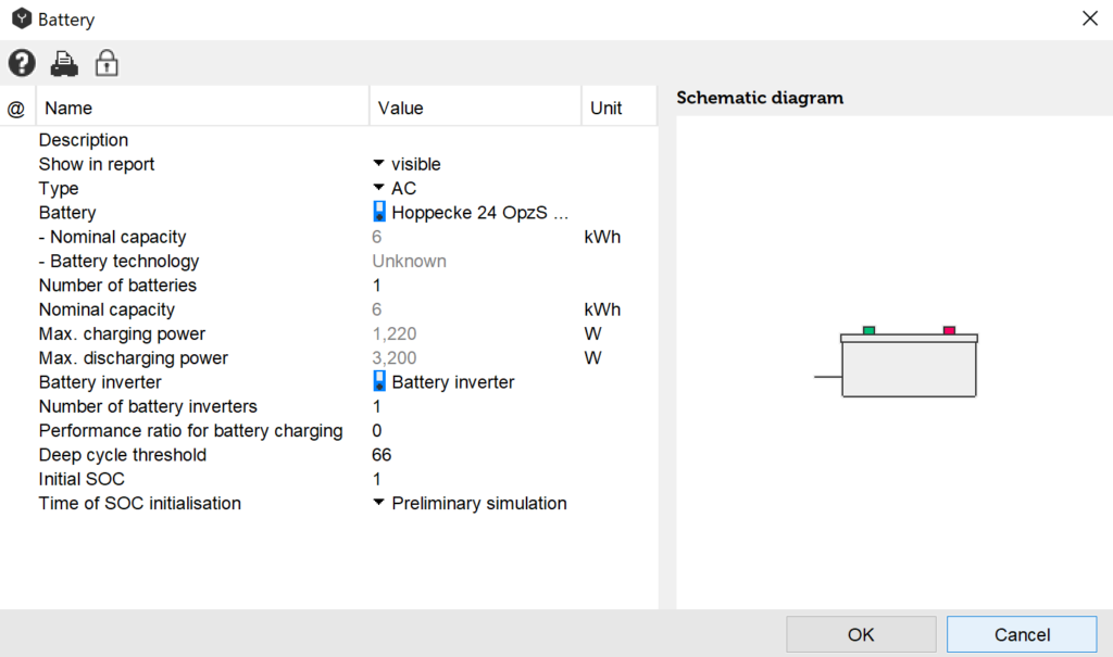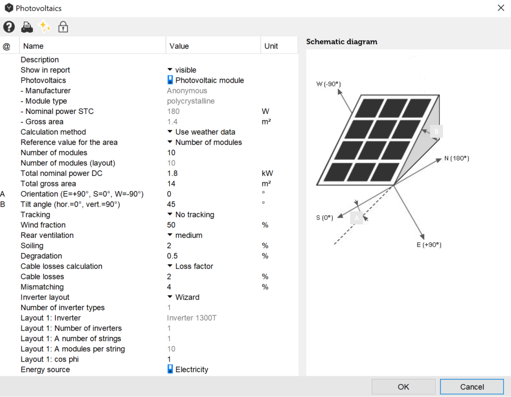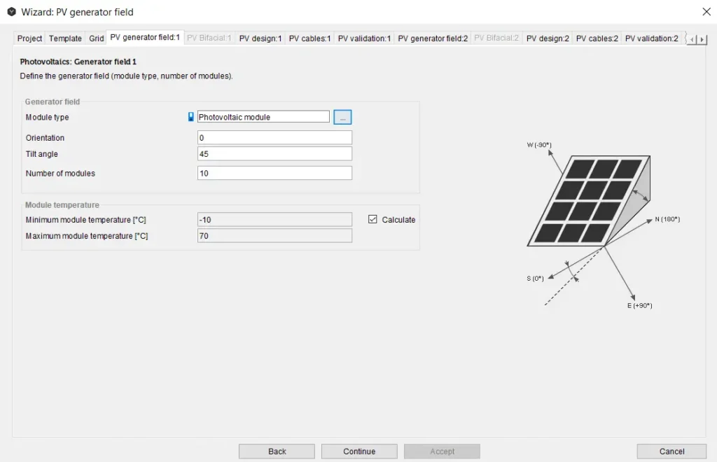 All parameters defined with the Wizard can be changed manually in the photovoltaic component. After all the changes have been entered, the validation through the Wizard must be carried out to ensure validity of the system.