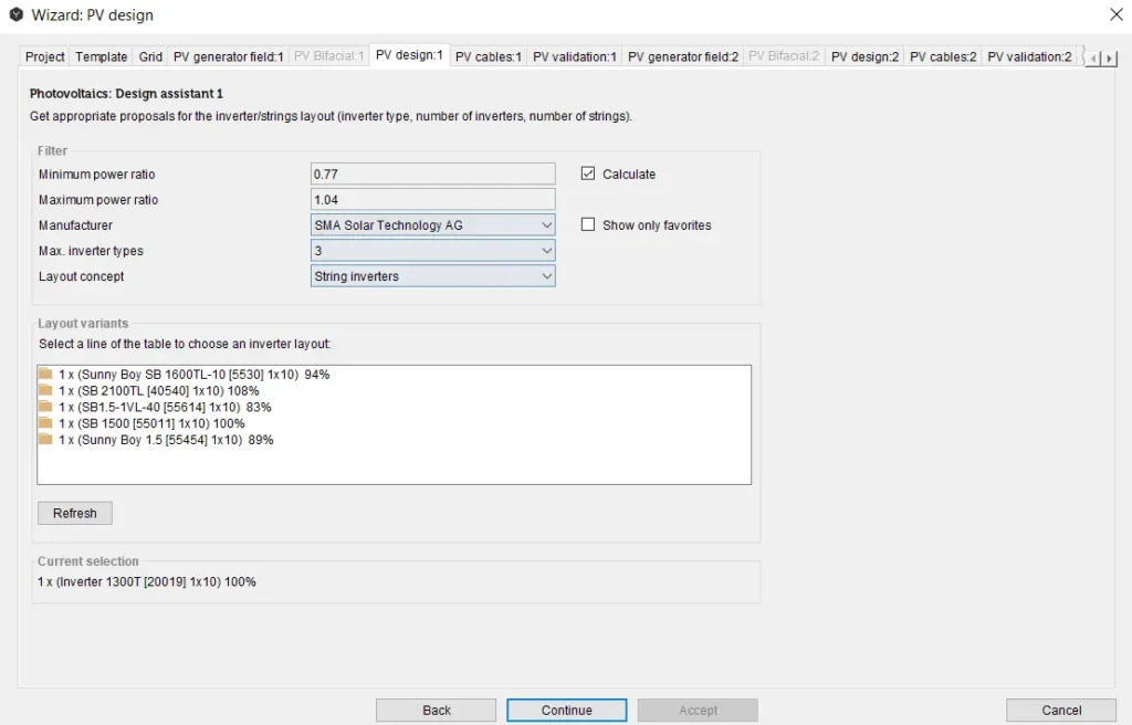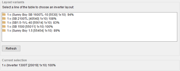 | Layout concept | One of the following concepts can be chosen: Microinverters – 1 inverter pro module String inverters – 1 string per MPP-tracker Central inverters – at least 2 parallel strings per MPP-tracker Uniform – 1 type per layout variant Mixed – allow mixing different inverter types in one layout variant. The combination of different concepts is not allowed. |