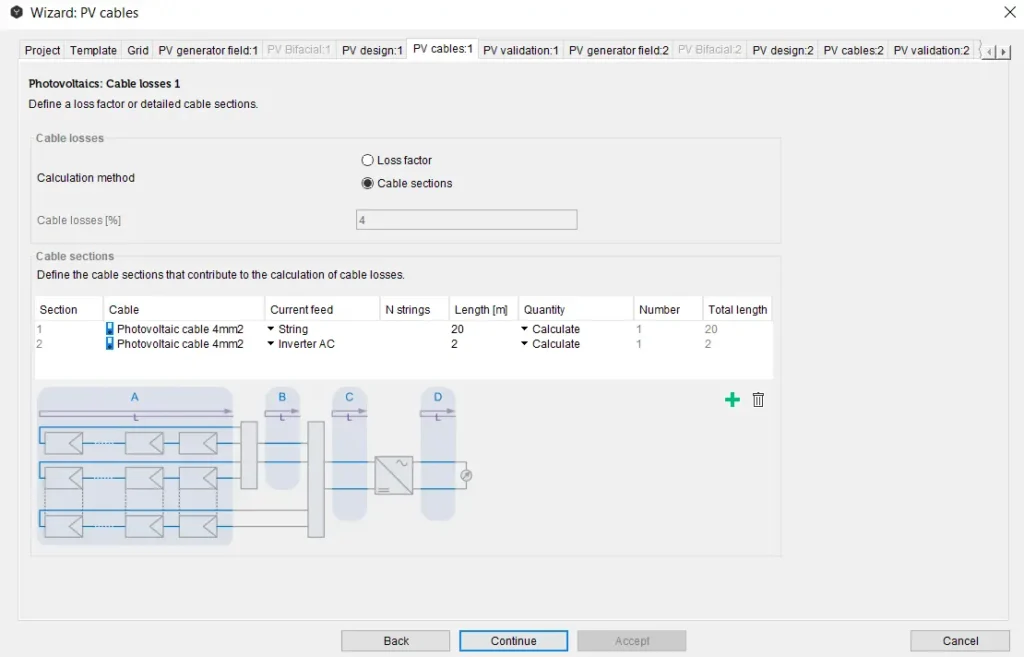 In the next step the cable losses are defined by the simple loss factor or detailed cable sections.