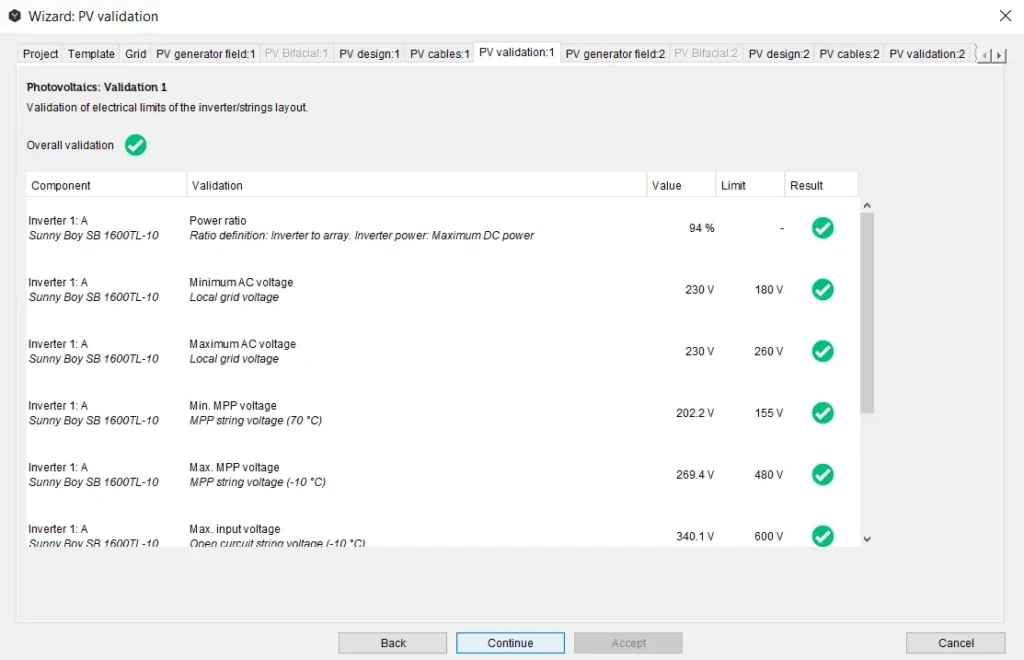 The next step in the Wizard is the validation of the electrical limits of the inverter/strings layout. Validation can show an OK (green tick), error (red cross) or warning (yellow triangle) for each component in the system.