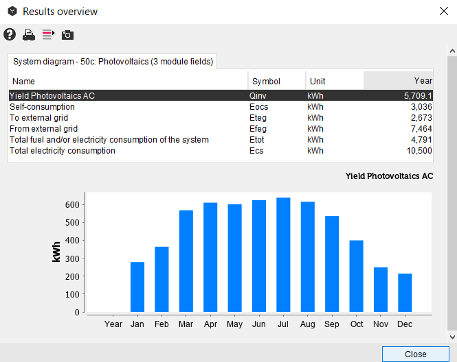 The annual consumption can be changed manually and the profile will be scaled up/down according to this number. After simulation Polysun shows the main system output parameters in the Results overview.
