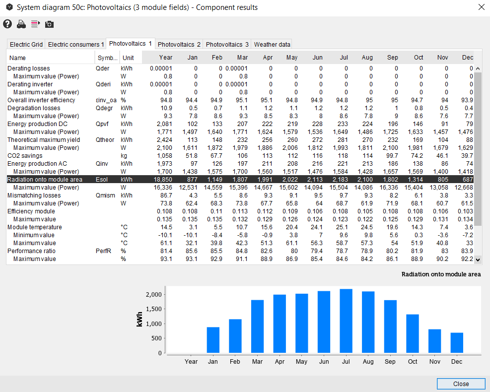 The electrical energy produced by the PV field is fed into the public electricity grid when ‘Feed-in’ is activated in the dialog window by clicking on the corresponding component.