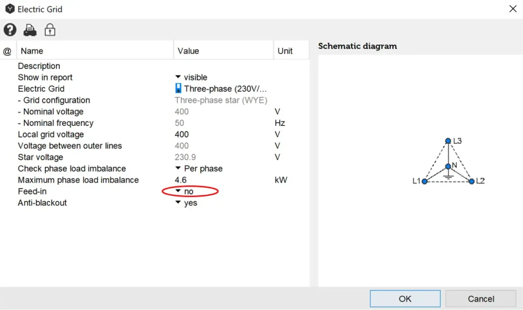 Off-grid PV systems can be designed the same way as grid-connected systems using the Wizard or manually, however in this case there shall be no feed-in into the electrical grid. These changes can be implemented in the dialog window of the electrical grid.