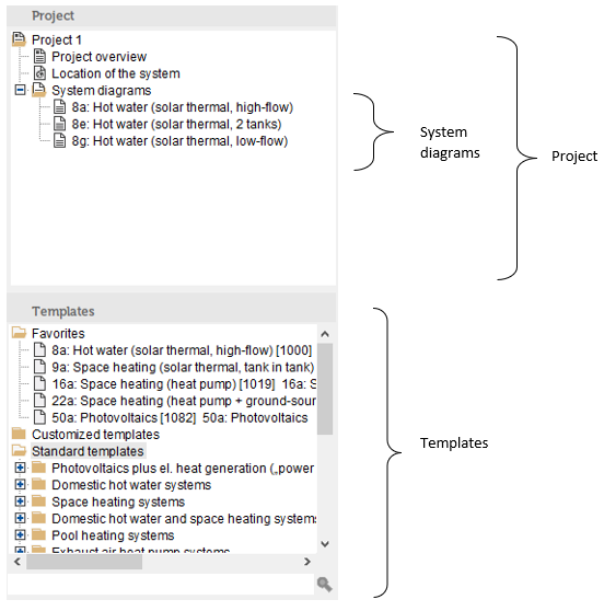 Polysun makes available a series of pre-defined templates. The template defines (as the system diagram) a solar energy system. The templates can be inserted into the project.