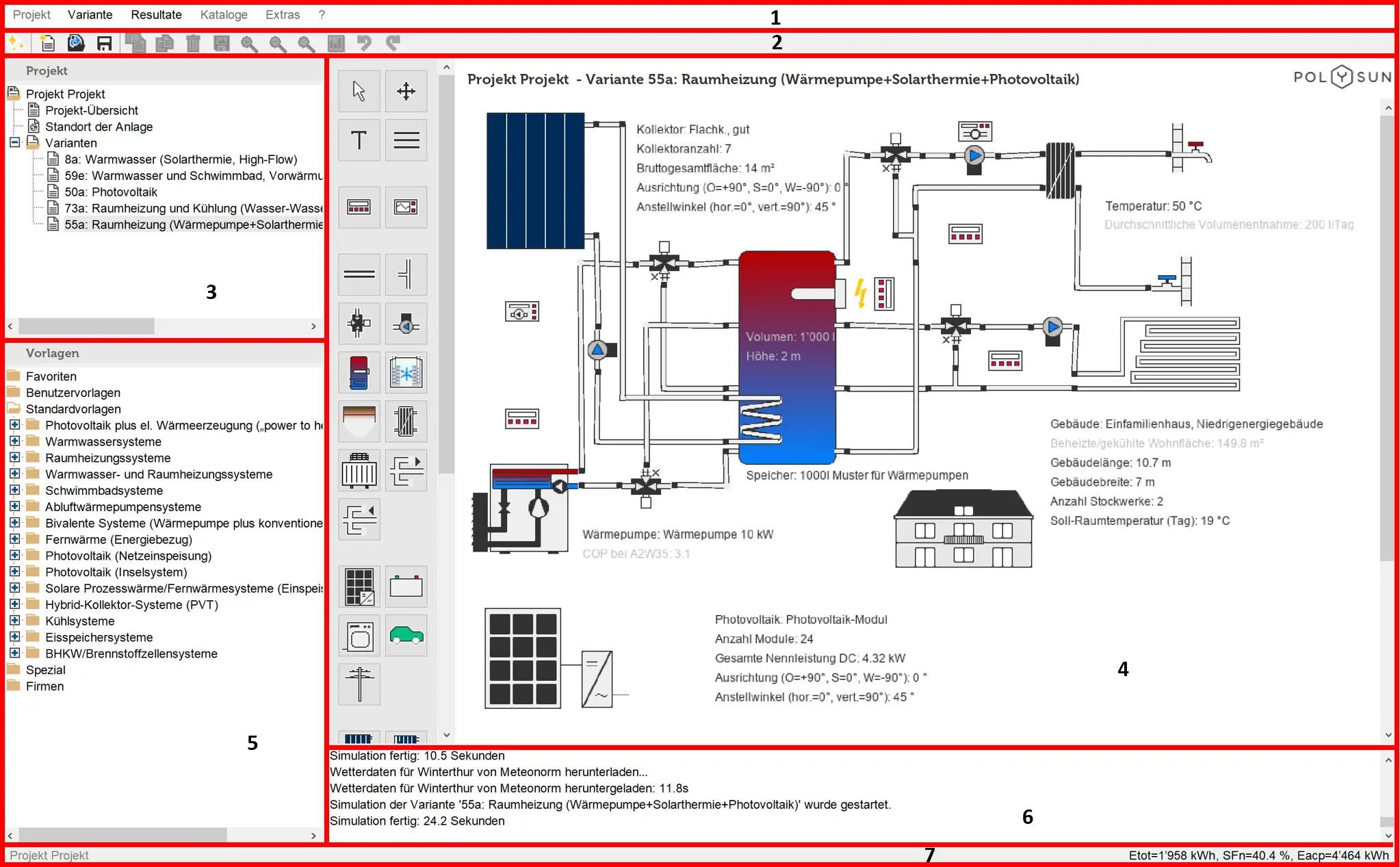 Polysun’s graphical user interface is essentially divided into three parts: on the top left are the project data, on the bottom left is the template collection; the working area is on the right-hand side. The parting lines between the above areas can be easily moved using your mouse so that the main window can be adjusted to fit the needs of all users.