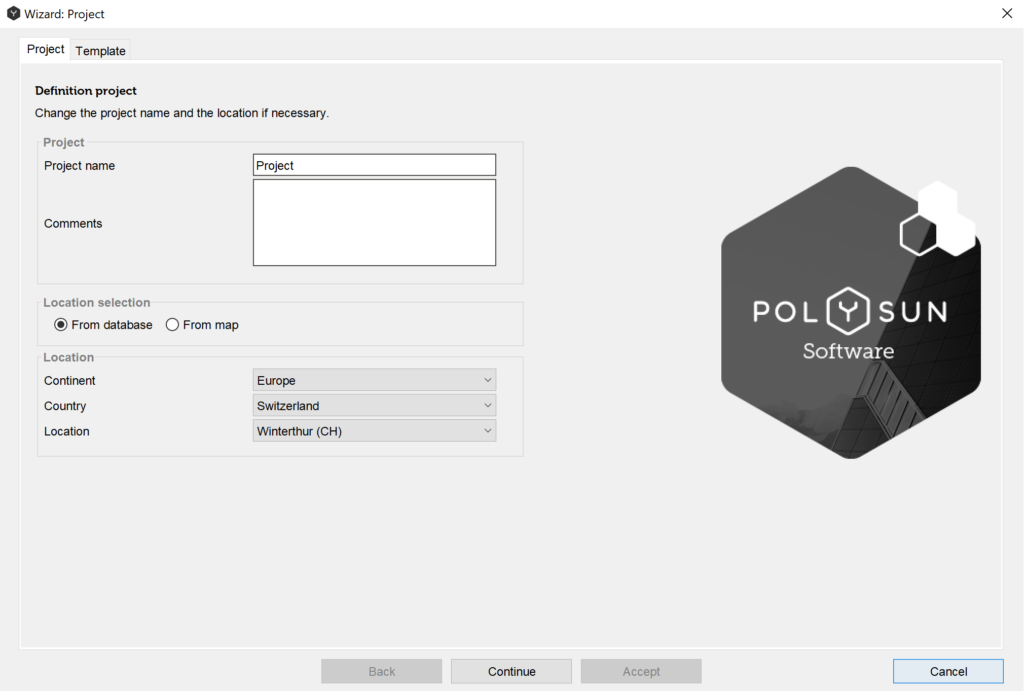 First choose a name for the project. A brief description of the project may be added. Next you will have to select the ‘Location’ of the system. The location can be chosen from the database or from the map. However, not all of the locations can be found on the map by entering the name in the field of the ‘Search’ option. In this case you would have to look for them manually on the map. Hint: if the message “No coverage” (Warning 191/24) appears, then it refers only to the natural horizon, the weather data are still interpolated and the location can be simulated.