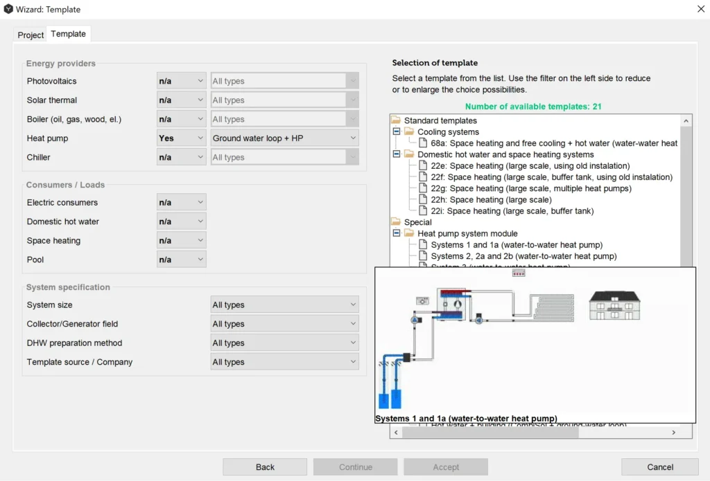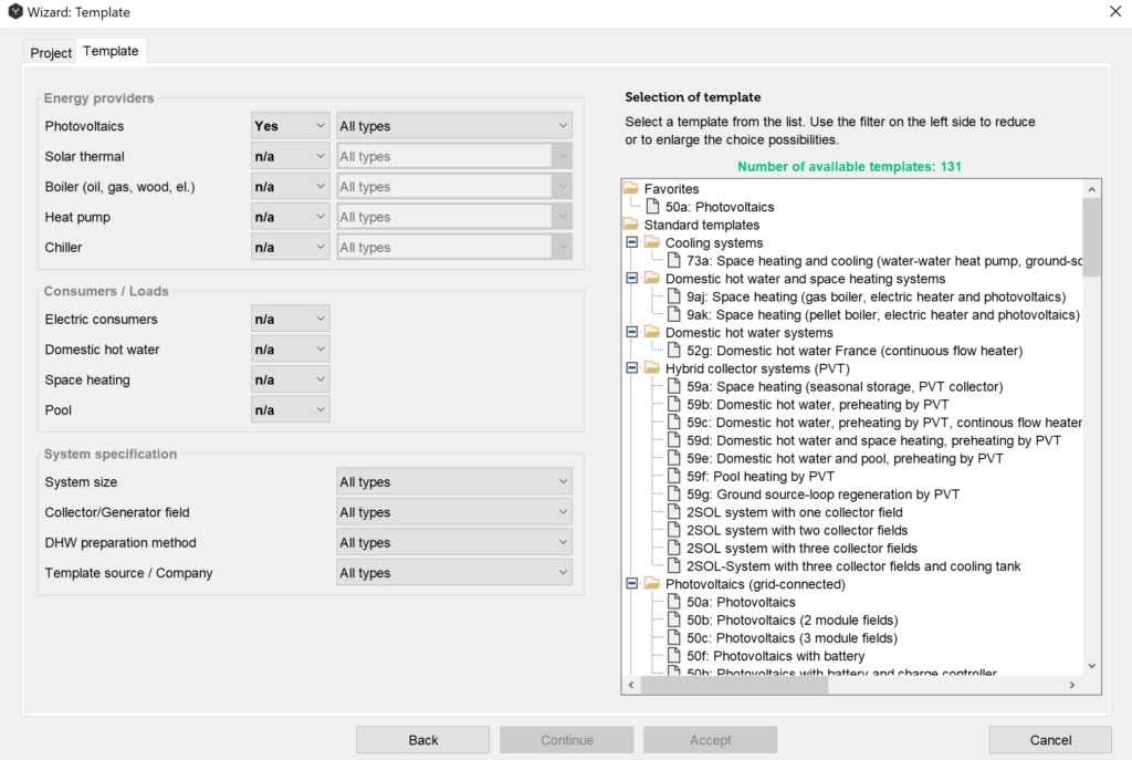 In the next dialog window you can choose a corresponding template by choosing the required energy providers, energy consumers/loads and system specification.