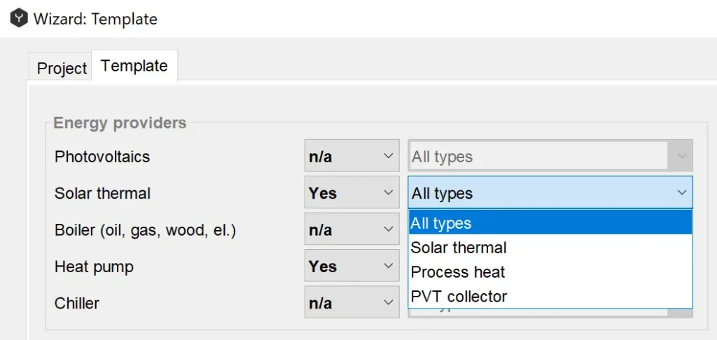 In the drop-down menus you can first choose which energy providers your project should contain. Here you can choose one or more types of technologies (for example solar thermal and a heat pump).