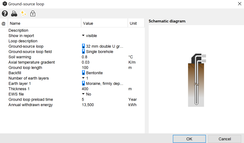 Depending on output requirements and local conditions a ground-source loop can reach a depth in the range of 50 to over 100 metres. Three different types of ground-source loops (single-U, double-U and coaxial) are typically lowered into the borehole. The mathematical model that Polysun uses for ground-source loops was imported from the EWS programme.