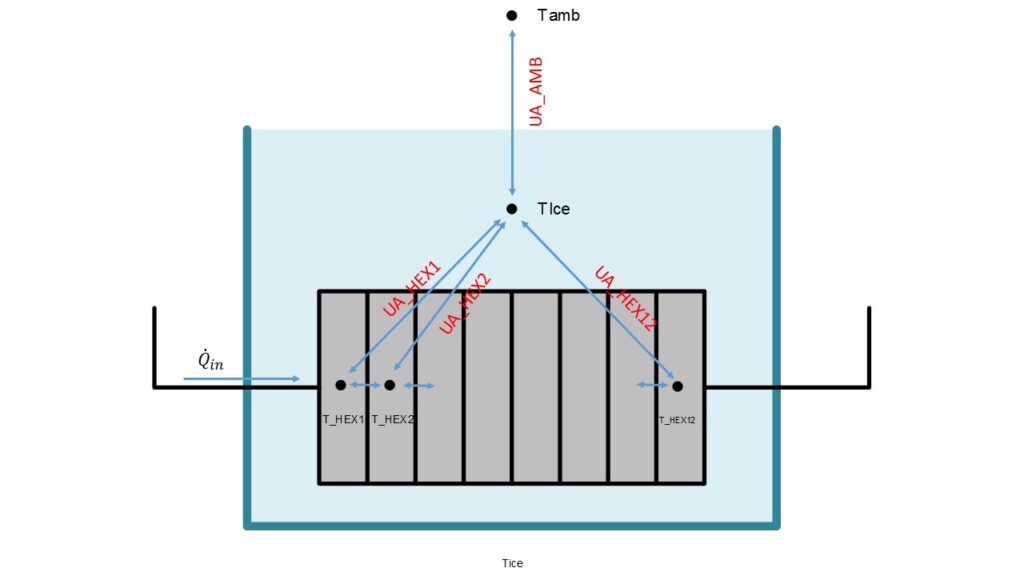 All UA-values are a combination of heat transfer area product between heat exchanger fluid and heat exchanger wall \(UA_{in}\), through the wall \(UA_{wall}\), through the ice \(UA_{ice}\) and from the wall or the ice layer to the storage water \(UA_{out}\).