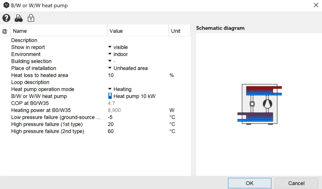 Optionally, the cooling power may be also indicated. Where this is greater than 0, the internal losses of the heat pump will be taken into consideration in the simulation.
