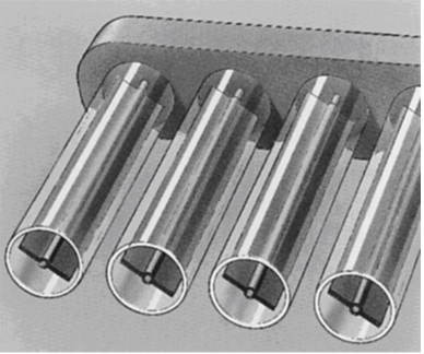 (Vacuum) tube collectors (illustration on the right): are especially ideal for the production of hot water or where external temperatures are generally low (or when a considerable part of solar irradiation takes place in winter). This is based on the idea that the absorber in a vacuum tube only loses energy for thermal radiation. In addition, the reflective behaviour of light and the geometry of the tube in glass contributes to making the obliquely falling light arrive more efficiently to the absorber compared to what happens in flat-plate collectors. Overall, tube collectors are the most expensive though, and for certain uses are not always as suitable as flat-plate collectors.