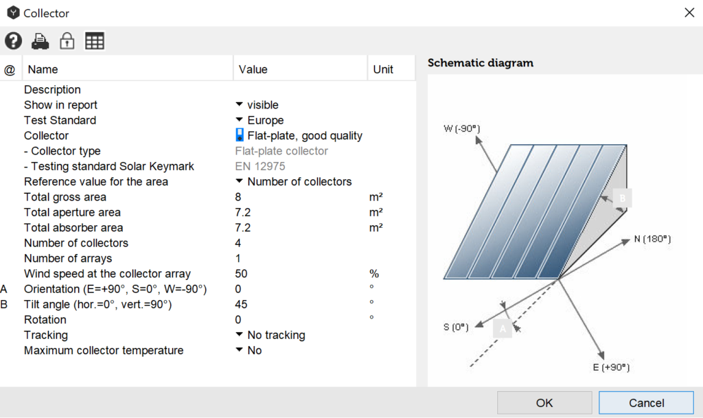 | Nsis-Axis: | The orientation (tubes at a 90° horizontal or vertical elevation) for tube collectors. Mostly irrelevant in case of flat-plate collectors. |