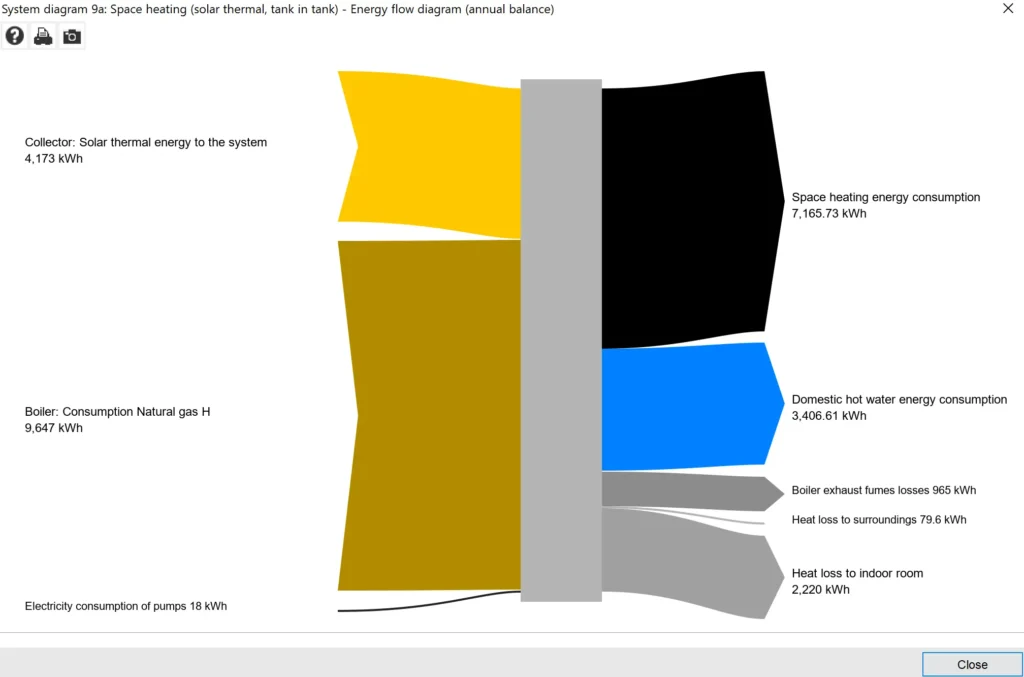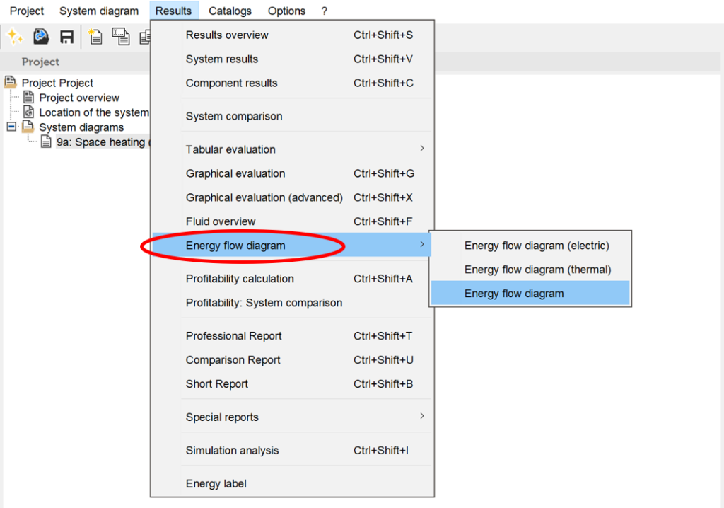 The energy flow diagram is a graphical representation of the energy balance of the designed system. It can be opened in the ‘Results’ tab or by the keyboard command Ctrl+Shift+E.