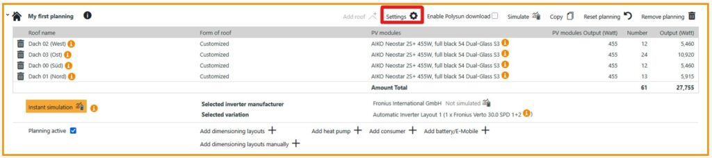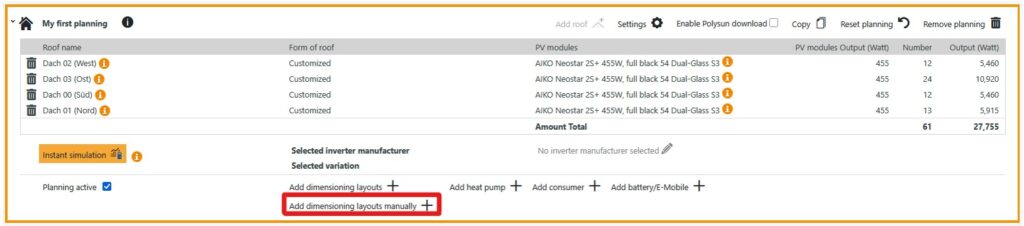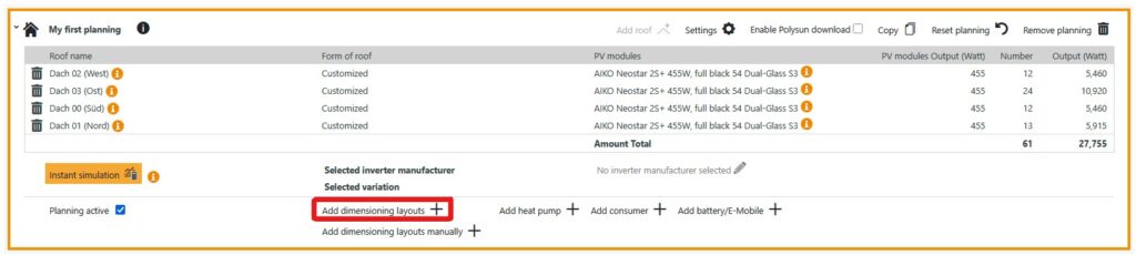 To add an automatic inverter design variant to the planning, please click on “Add dimensioning layout”.
