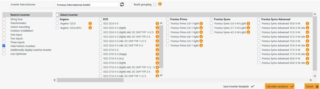 This opens another menu. First select an inverter manufacturer here. In the “Restrict inverter” column, you can restrict the inverter search using a number of criteria.