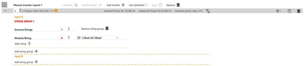 A separate input is displayed for each MPP tracker in Polysun SPT (input A and B in the illustration). If you have added several roofs with the same modules to your planning, the option to create additional string groups per input will also appear.