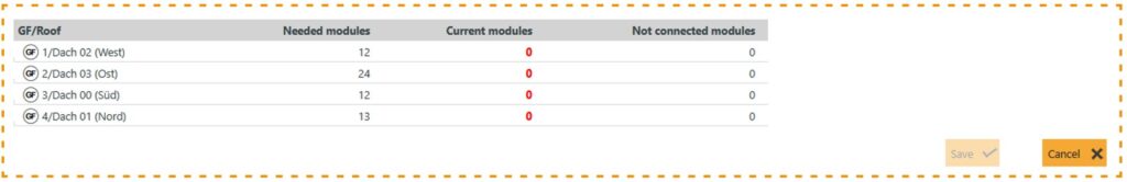 At the end of the selection you will see a list of the roofs. This clearly shows how many modules still need to be strung per roof. Once all modules have been strung, the manual inverter selection can be saved.
