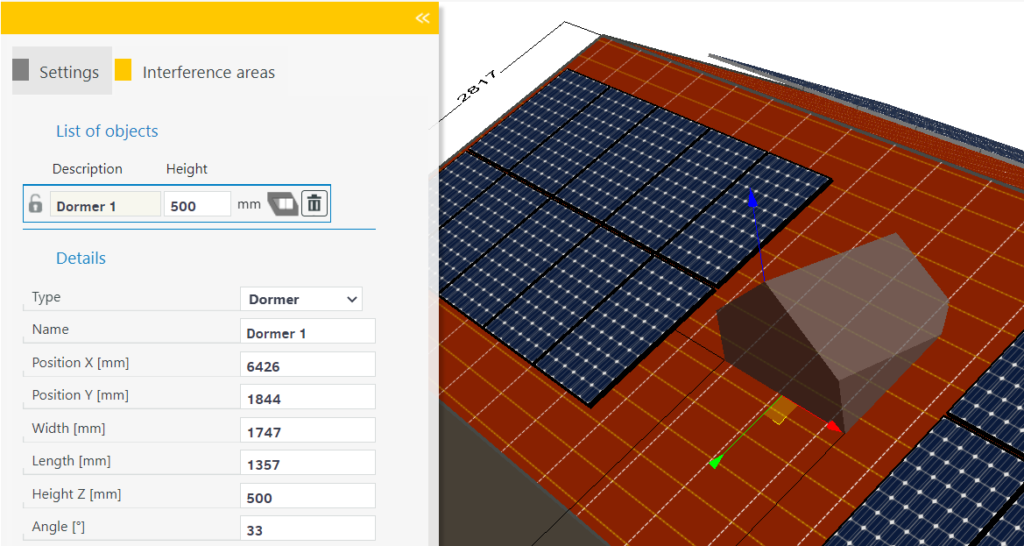 The easiest way to draw dormers is directly in the Position menu. To do this, select the Draw tool and draw a rectangle directly on the roof area. This opens the menu directly and you can continue to edit the interference area. In the menu, change the type of the interference area to ” dormer”. This will give you a direct preview of how the dormer will look. You can now modify the dormer directly using the coordinate system or by entering dimensions in the menu. Click on a free space in the window to confirm the input.