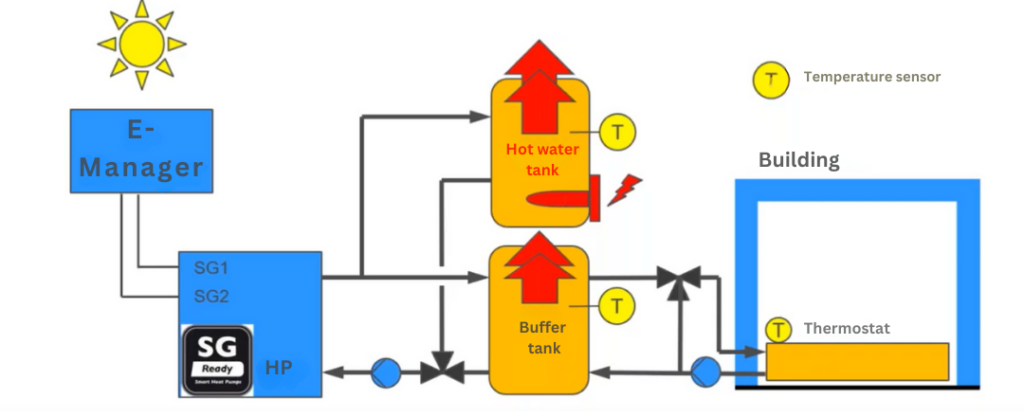 Today’s standard is heat pumps with the SG-Ready option. The heat pump is connected to an energy manager. This allows the temperature of the buffer tank or hot water tank to be intelligently controlled depending on the solar power generation. The mixing valve ensures that the temperature in the building does not become too high. The SG-Ready interface recognizes 4 operating status: blocked operation (mode 1), normal operation (mode 2) encouraged operation (mode 3), and ordered operation (mode 4). Further information can be found in the webinar.