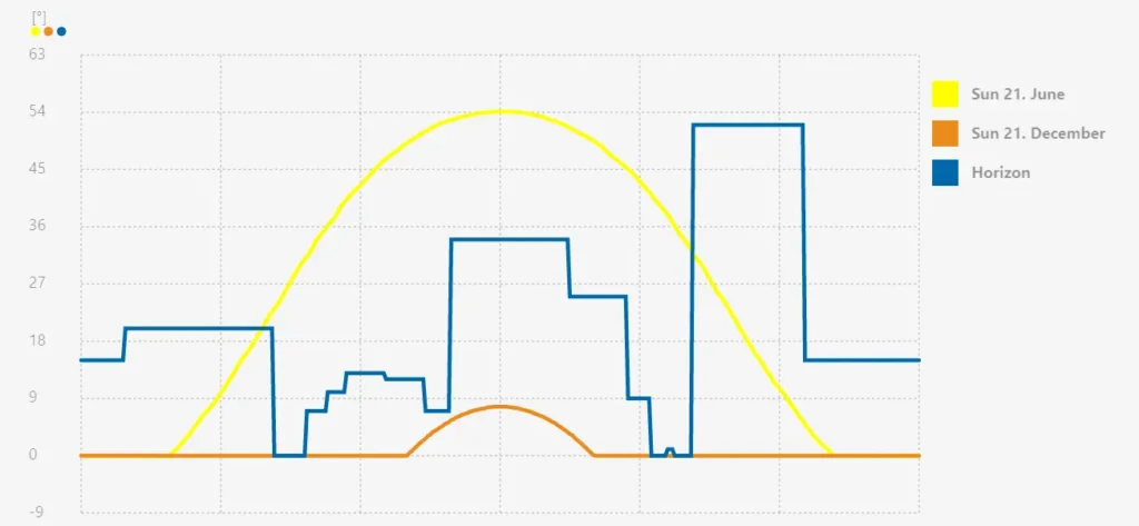 L’éditeur d’horizon permet d’ajouter des obstacles individuels les uns après les autres à la ligne d’horizon. Sélectionnez le centre du champ PV comme point de référence pour la ligne d’horizon. Inscrivez d’abord la valeur de départ de l’azimut, la valeur finale de l’azimut et l’horizon (hauteur) d’un obstacle dans les champs prévus auparavant. Cliquez ensuite sur « Générer » pour ajouter l’obstacle à la ligne d’horizon. Répétez la procédure pour un autre obstacle.