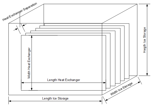 Le réservoir de glace est en échange thermique avec son environnement – le terrain ou la cave – et avec les échangeurs thermiques qui relient le réservoir de glace aux autres composants. La connexion au sol est modélisée par une strate de terre qui relie le réservoir de glace à la température de la terre non perturbée. En outre, l’emplacement de l’entrepôt de glace ne peut être modifié qu’en un sous-sol avec une température ambiante fixe dans le modèle de plaques d’échangeur thermique.