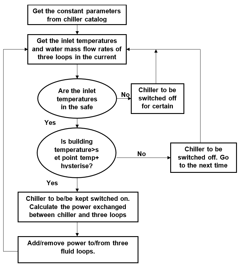 Le déroulement typique du programme des calculs de transfert d’énergie du modèle d’appareil frigorifique à absorption et les critères de réglage des différents états opérationnels sont présentés à la figure suivante. Il est important que les réglages appropriés soient utilisés pour l’appareil frigorifique et les circuits raccordés. Les critères de réglage respectifs doivent être définis dans les réglages eux-mêmes en relation avec le concept de refroidissement. Il est recommandé de lire les info-bulles respectives sur les entrées et les sorties des régulateurs.