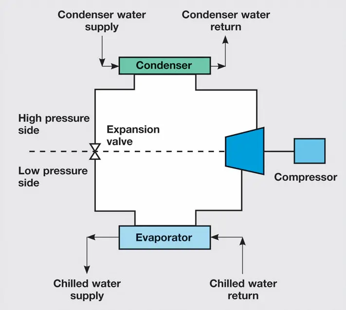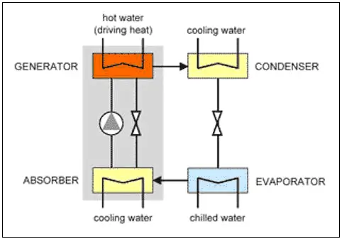 Refroidisseurs à compression et appareils frigorifiques à énergie thermique. Les opérations respectives de ces machines sont représentées sur les figures suivantes. Comme on peut le constater, la principale différence entre les deux machines est que le compresseur du modèle à compression est remplacé dans l’appareil frigorifique à énergie thermique par un absorbeur, une pompe et un générateur, ce qui signifie que ce dernier a une consommation électrique inférieure à celle de l’autre cycle. Un autre avantage des appareils frigorifiques à énergie thermique est que l’énergie thermique peut être utilisée comme l’énergie solaire à une température moyenne à élevée, même avec une très bonne adéquation entre le rayonnement solaire disponible et le besoin en énergie de refroidissement en été. Cependant, les appareils frigorifiques à énergie thermique ont un coefficient de performance inférieur à celui des refroidisseurs à compression.