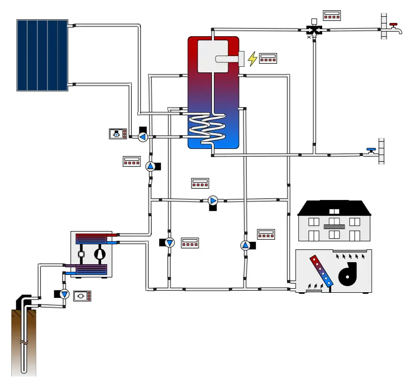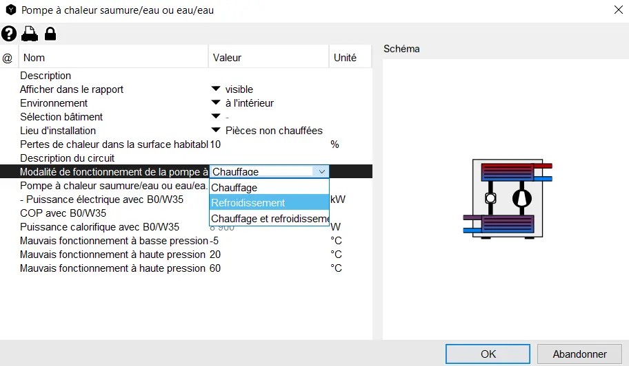 La Figure suivante explique un modèle inclus dans Polysun où le chauffage, l’eau chaude et le besoin en énergie de refroidissement peuvent être simulés par la pompe à chaleur en mode chauffage et refroidissement. La sonde géothermique est utilisée comme une source d’énergie thermique à basse température en mode chauffage et comme un absorbeur d’énergie en mode refroidissement. Les valeurs de mauvais fonctionnement de la pression ont également été saisies pour le mode refroidissement.