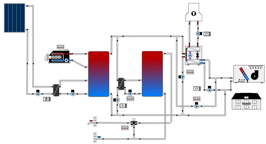 Différentes configurations de systèmes de refroidissement par absorption peuvent être simulées avec Polysun. Par exemple, l’un de ces systèmes est illustré à la figure suivante, dans lequel des capteurs solaires thermiques et une chaudière à gaz sont utilisés pour couvrir le besoin en énergie de chauffage en hiver et le besoin en énergie de refroidissement en été à l’aide d’un appareil frigorifique à absorption. De même, le besoin en eau chaude est couvert toute l’année par un tel système. Dans ce système, une tour de refroidissement à évaporation est utilisée, mais elle peut être remplacée par une tour de refroidissement à sec, une sonde géothermique ou une piscine. Deux réservoirs de chauffage et d’eau chaude séparés sont représentés dans ce modèle.