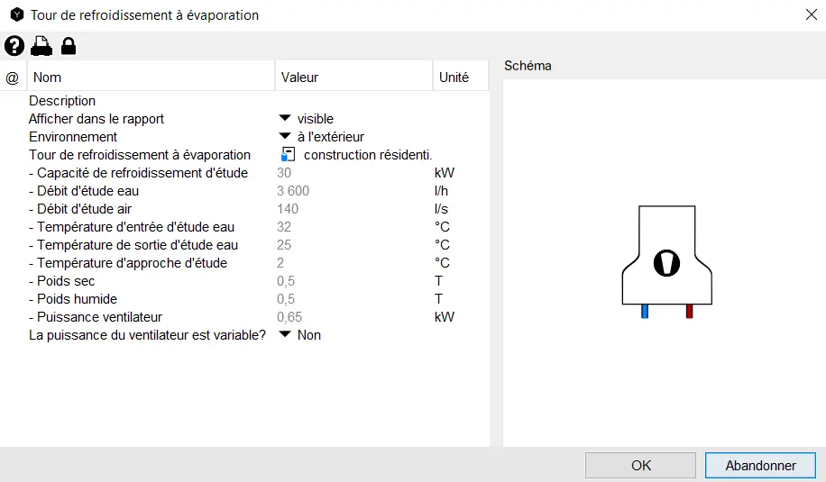 Comme décrit ci-dessus, différentes tours de refroidissement peuvent être raccordées au appareil frigorifique comme absorbeurs d’énergie. La figure suivante montre la boîte de dialogue « tour de refroidissement à évaporation » ou « tour de refroidissement par évaporation ». Les tours de refroidissement utilisent le principe de l’évaporation ou du refroidissement par « bulbe humide » pour évacuer la chaleur. Les principaux avantages par rapport aux échangeurs thermiques classiques sont les suivants :