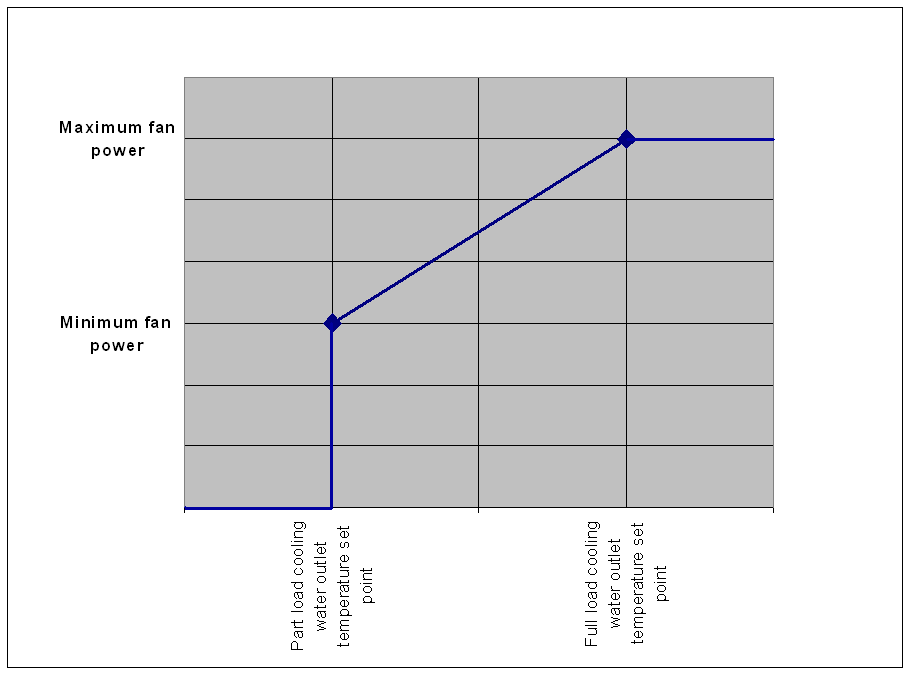 On peut observer que l’efficacité thermique augmente lorsque la température de sortie de l’eau de refroidissement atteint la température humide de l’entrée d’air. En d’autres termes, des températures d’approche plus basses signifient une meilleure efficacité thermique. La température d’approche généralement acceptable est supérieure à 2. Comme on peut le voir sur la figure suivante, il est possible d’utiliser un ventilateur à vitesse variable. Cela aurait l’avantage de réduire la consommation des ventilateurs en chargement partiel.