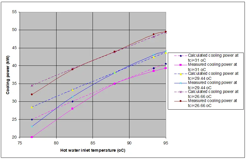La figure suivante montre un bon rapport entre la puissance mesurée et calculée à différentes températures d’entrée de l’eau de chauffage et de l’eau de refroidissement.