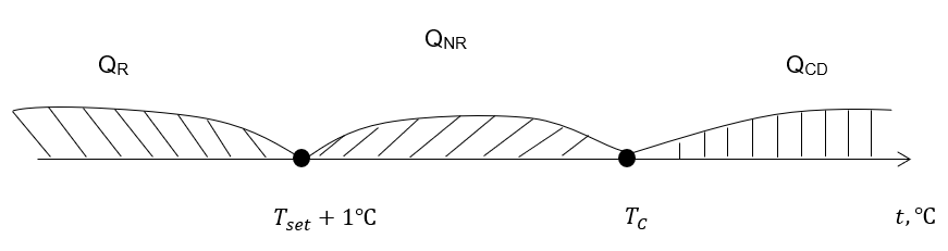 - Si la température ambiante est supérieure à la température ambiante nominale \(T_{set}\) + 1℃ mais inférieure à la température ambiante nominale refroidissement \(T_{C}\) les pertes thermiques ne peuvent pas être utilisées dans le bâtiment (pertes non réutilisables QNR),
