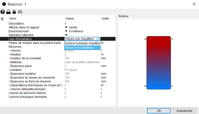 L’emplacement des composants thermiques par rapport au bâtiment revêt une grande importance. Trois endroits sont disponibles pour cela : à l’extérieur du bâtiment, dans une pièce chauffée ou dans une pièce non chauffée du bâtiment. Par exemple, le réservoir peut être installé à l’intérieur ou à l’extérieur du bâtiment. Polysun vous permet également de concevoir un projet comportant plus d’un bâtiment. Si vous décidez de placer le réservoir à l’intérieur du bâtiment, vous devez préciser où le réservoir sera installé, à savoir dans un espace chauffé ou non. Si vous installez le réservoir dans un espace non chauffé, le pourcentage de perte thermique vers les espaces chauffés peut être défini.