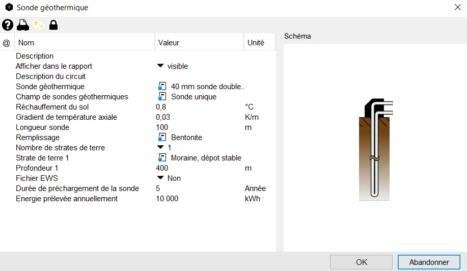 Pour simuler le vieillissement de la sonde, il est possible de spécifier l' »énergie prélevée annuellement » et la « durée de préchargement de la sonde ». La sonde est préchargée avec une charge constante pendant cette période. Si l’on souhaite calculer plus précisément le comportement à long terme de la sonde, il est possible de régler la durée de la simulation préliminaire (dans le menu sous Variante – Durée de la simulation préliminaire). Avec cette simulation préliminaire, le système entier est simulé, ainsi le profil de charge effectif est appliqué à la sonde. Si l’on souhaite simuler 50 ans, il faut entrer la valeur 17885 (49 * 365), c’est-à-dire que 49 ans sont pré-simulés et que la simulation annuelle habituelle suit.Le chauffage du sol définit la différence entre la température moyenne annuelle de l’air et la surface du sol. Les valeurs typiques sont: