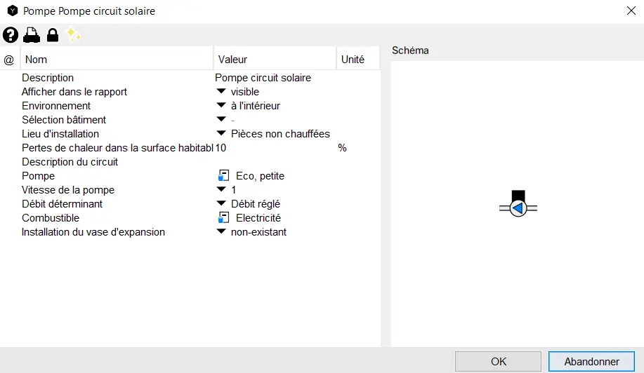 - Clapet anti-retour : Il n’y a pas de clapets anti-retour dans Polysun. Dans la réalité, les clapets anti-retour sont utilisés pour permettre les travaux de maintenance, mais ils ne sont pas importants pour la simulation. En outre, des clapets anti-retour sont installés lorsqu’il faut empêcher un flux involontaire dans la direction opposée à celle de la pompe lorsque celle-ci est arrêtée. Dans Polysun, les pompes sont idéales, c’est-à-dire que lorsque la pompe est arrêtée, rien ne coule, ni dans la direction de la pompe, ni en direction inverse. Les directions du flux dans les tubes sont donc clairement définies dans tous les cas par les pompes et les vannes trois voies, ce qui rend les clapets anti-retour inutiles pour la simulation.