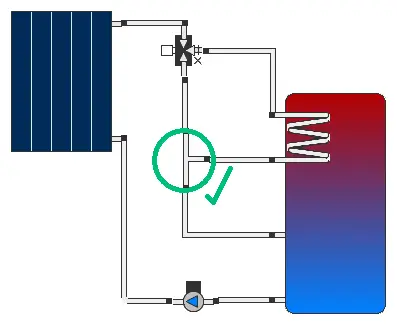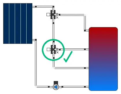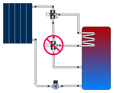 - Générateur de flux / Vannes trois voies : Il doit y avoir exactement un générateur de flux par circuit. Les pompes connectées en série ne sont pas possibles. Si des vannes trois voies sont utilisées dans des endroits où la direction du flux est déjà définie, une surdéfinition du flux se produit. Voici quelques exemples: