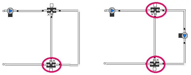- La direction du flux dans un circuit n’est pas déterminée, il manque une pompe ou une vanne trois voies. Un circuit peut également être surdéterminé, par exemple si deux pompes sont en série dans le même circuit. Les composants suivants déterminent le débit :