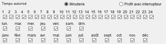 La « fonction minuterie » peut être utilisée avec toutes les réglages, ou bien il est possible de définir des temps autorisés pendant lesquels le réglage doit être en fonction. Pour ce faire, saisissez les heures, les jours de la semaine, les mois pendant lesquels le contrôle doit être « actif », selon les besoins. En mode inactif, les sorties sont nulles.