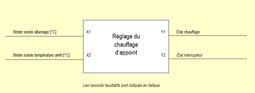| Y1: État chauffage Y1 = Y2 Y2: État interrupteur | — | X1: Strate sonde allumage [°C] | Y1=1 si X1 < Température de mise en marche du réservoir [°C] Y1=0 si X2 > Température d’arrêt du réservoir [°C] |