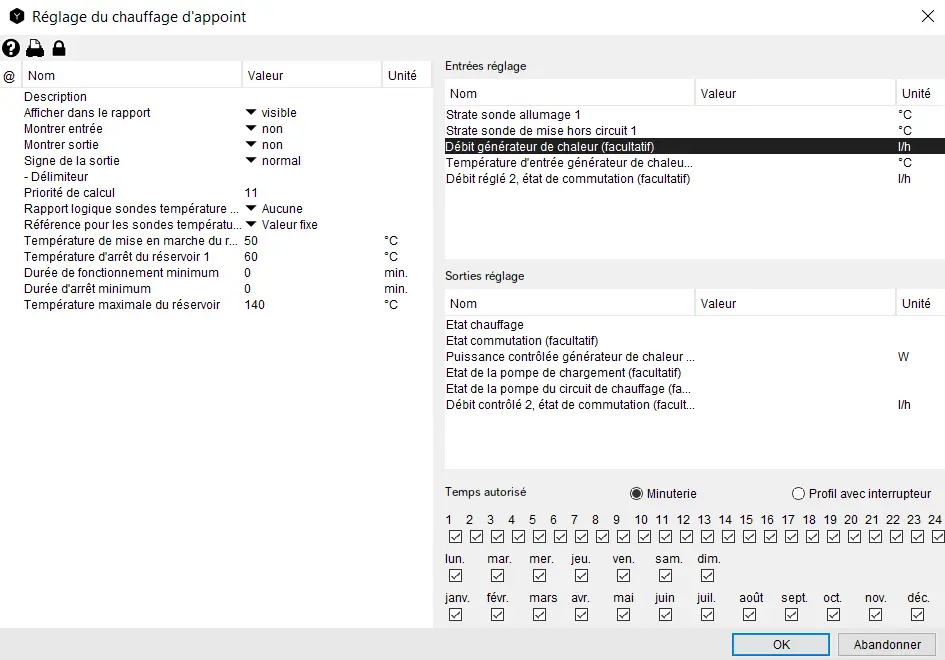 Le réglage du chauffage d’appoint est un réglage à deux canaux et régule l’état et le débit de la chaudière et l’état d’un autre composant sur la base des températures du réservoir en deux strates.