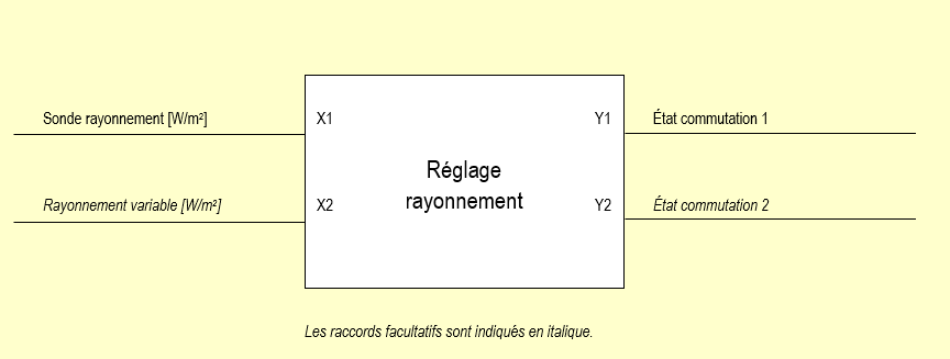 Le réglage du rayonnement est un réglage à un canal et régule l’état de deux composants au maximum en fonction des valeurs de rayonnement. Il est principalement utilisé comme réglage pour les circuits solaires.