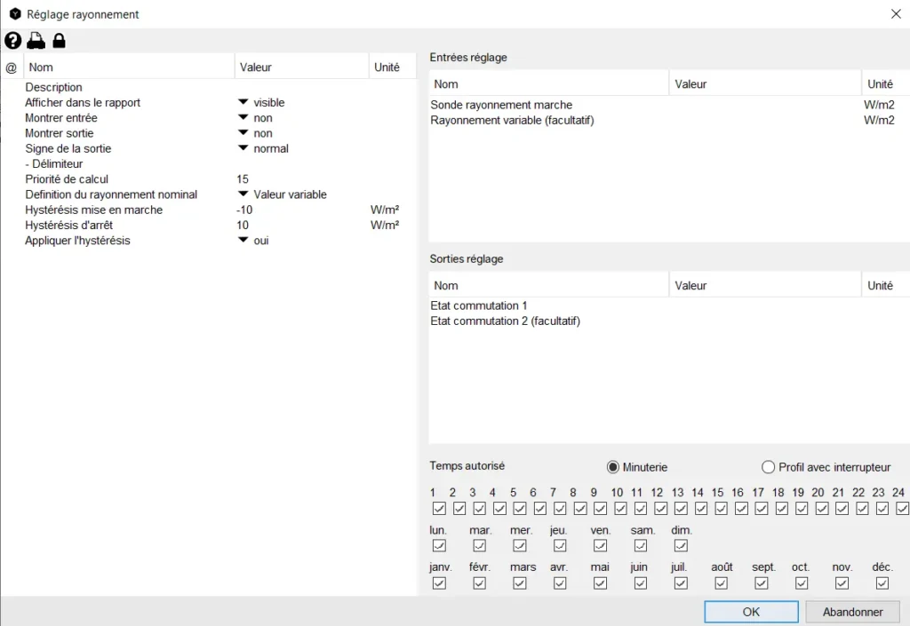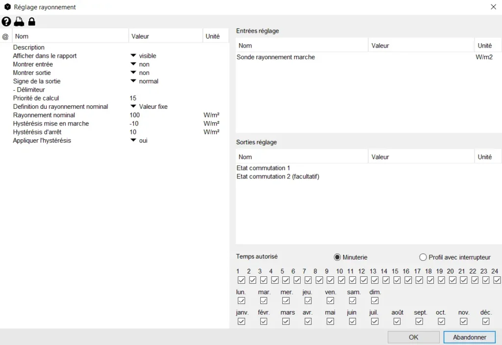 Avec ce réglage, la pompe se met en marche dès que le rayonnement global est supérieur à 100 W/m2.